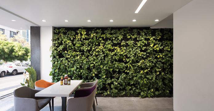 چراغ های Valman از محصولات Fenos با پخش نور نامتقارن ( والواشر ) نور یکنواخت مناسبی روی سطوح عمودی و پوشش گیاهی تامین کردهاند. نوارهای LED سری Beno نور خطی را در شکافها تامین کرده و پروژکتورهای سری Silva Maxi برای نورپردازی نمای ورودی ساختمان استفاده شدهاند.